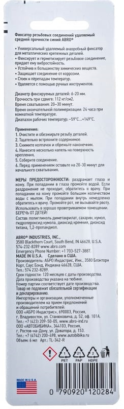 Фиксатор резьбы ABRO средняя фиксация синий 6мл TL342R в Брянске