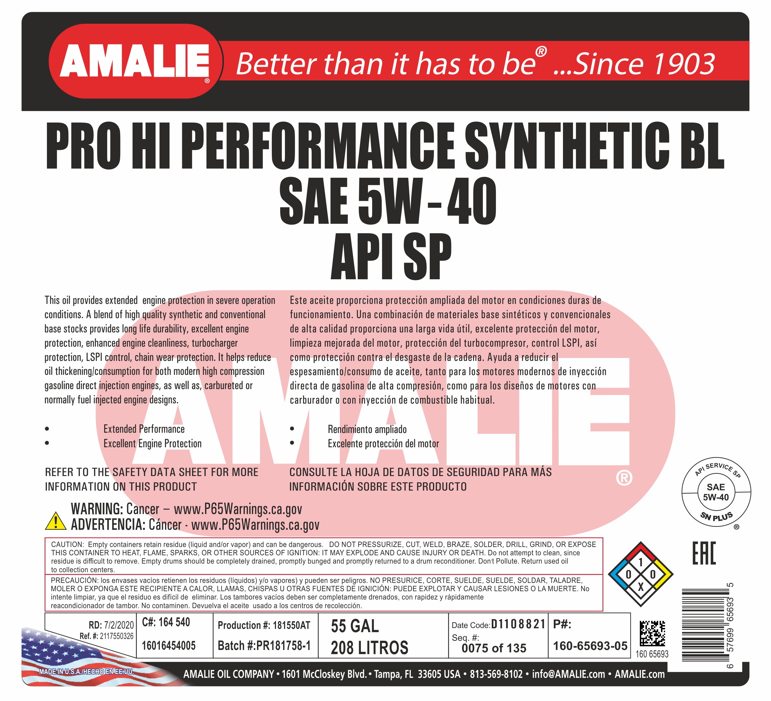 Масло моторное AMALIE PRO High Perf Synthetic 5w40 1л розлив из бочки в Казани