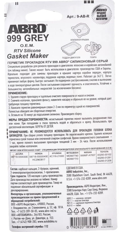 Герметик прокладка ABRO серый фирменный 85г 9AB в Шахтах